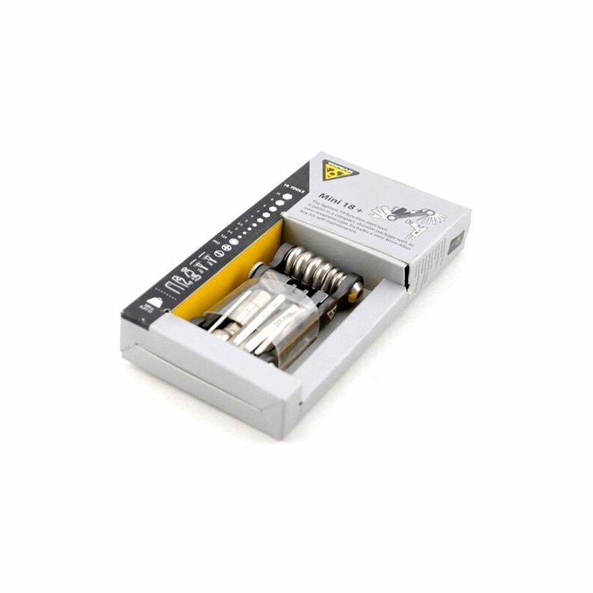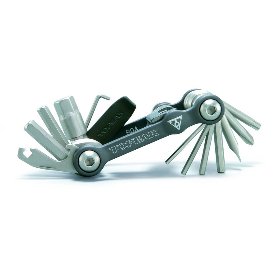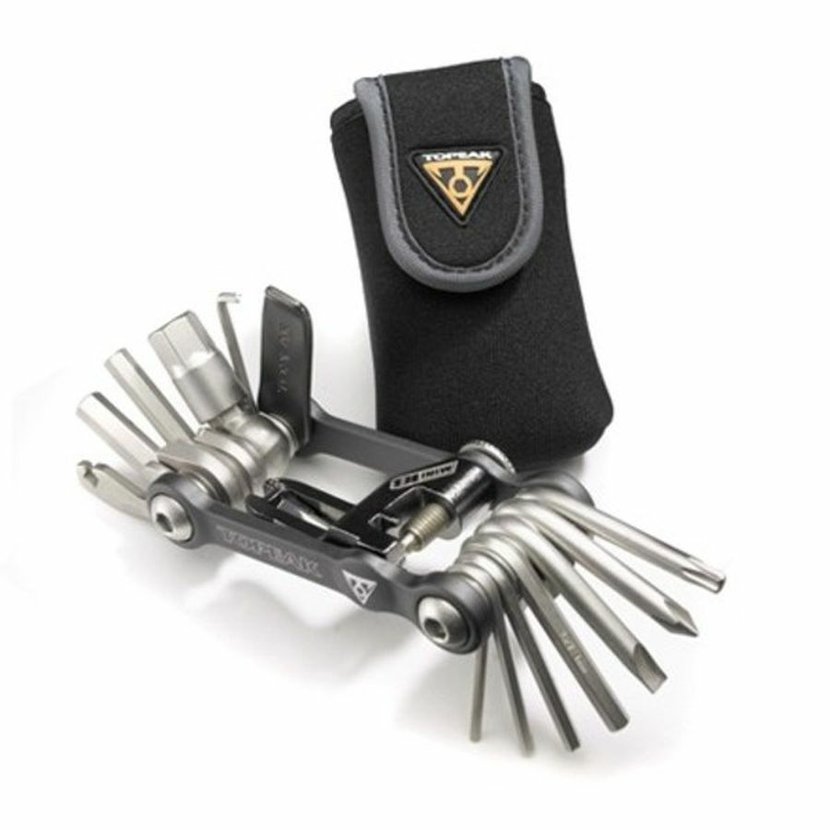 • inbus 2/2-L/2,5/3/4/5/6/8/10 mm • hviezdicový torx T25 • krížový a plochý skrutkovač • centrovací kľúč 1,8 a 2.0 (na otvárači fliaš a na nitovači) • odnímateľný nitovač reťaze z CrMo ocele so skrytým 4 mm inbusovým kľúčom na doťahovanie samotného tela multikľúča a výklopná lopatka pre prípad zatlačenia piestov diskovej brzdy pri zacvaknutých doštičkách • montpáčka z anodizovanej super tvrdej zliatiny - iba pre núdzové vyzúvanie / obúvanie plášťa • otvárač fliaš • chain pin breaker - nástroj na odlomenie čapu reťaze (na otvárači fliaš) • súčasťou je aj praktické prenosné púzdro z neoprénového materiálu • rozmery: 8,2 x 4,3 x2 cm • hmotnosť: 185 g
