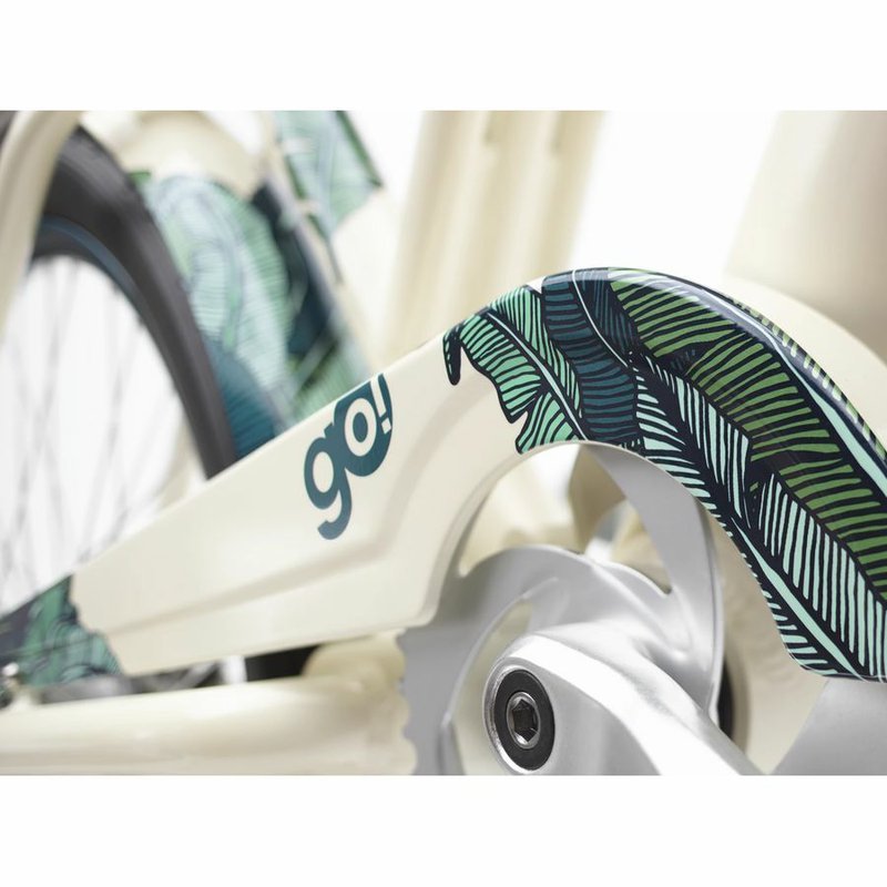 S Bali Go! sa ocitnete hlboko v džungli a bujnom tropickom dažďovom pralese na Bali. Rôzne sýte odtiene kovovo zelených listov na blatníkoch a kryte reťaze skvele ladia s krémovo sfarbeným rámom inšpirovaným bielymi piesočnatými plážami. Celkový vzhľad dopĺňa jedinečné sedlo a gripy s rovnakým listovým povrchovým vzorom a farebne zladený zvonček..